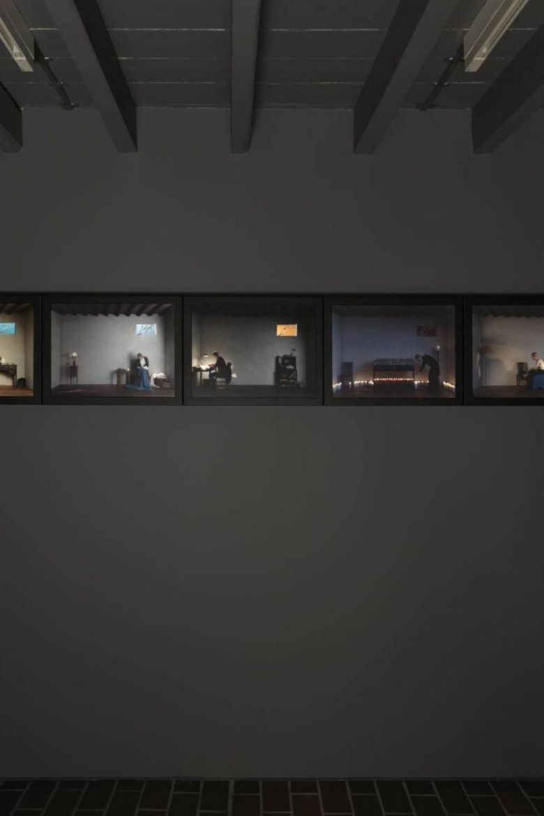 This video work is one of a group of pieces known as 'The Passions' which explores human emotions, inspired by early European devotional paintings. The five screens show different times of the day – morning, afternoon, sunset, evening and night. Each scene shows the female protagonist at a different task, from yoga exercises in the morning through to lighting candles in the evening and finally going to bed. In each scene, the tree outside the window is shown at different stages of its annual cycle, putting the woman's routine in the larger context of the cycles of nature. The work is based on a predella by the fourteenth century artist Andrea di Bartolo.